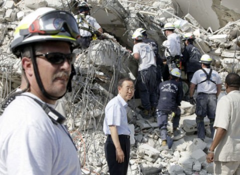 U.N. Secretary-General Ban Ki-moon, centre, visits the collapsed UN headquarters in Port-au-Prince.