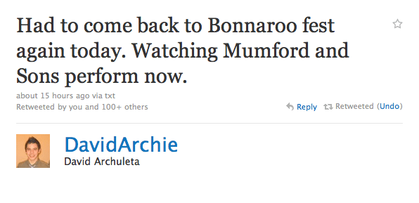 All I have wanted to talk about for 3 days is David and Bonnaroo! I LOVE that he tweeted that he had to go back. I just knew he would, lol. Also love that he wanted to, and just did it.