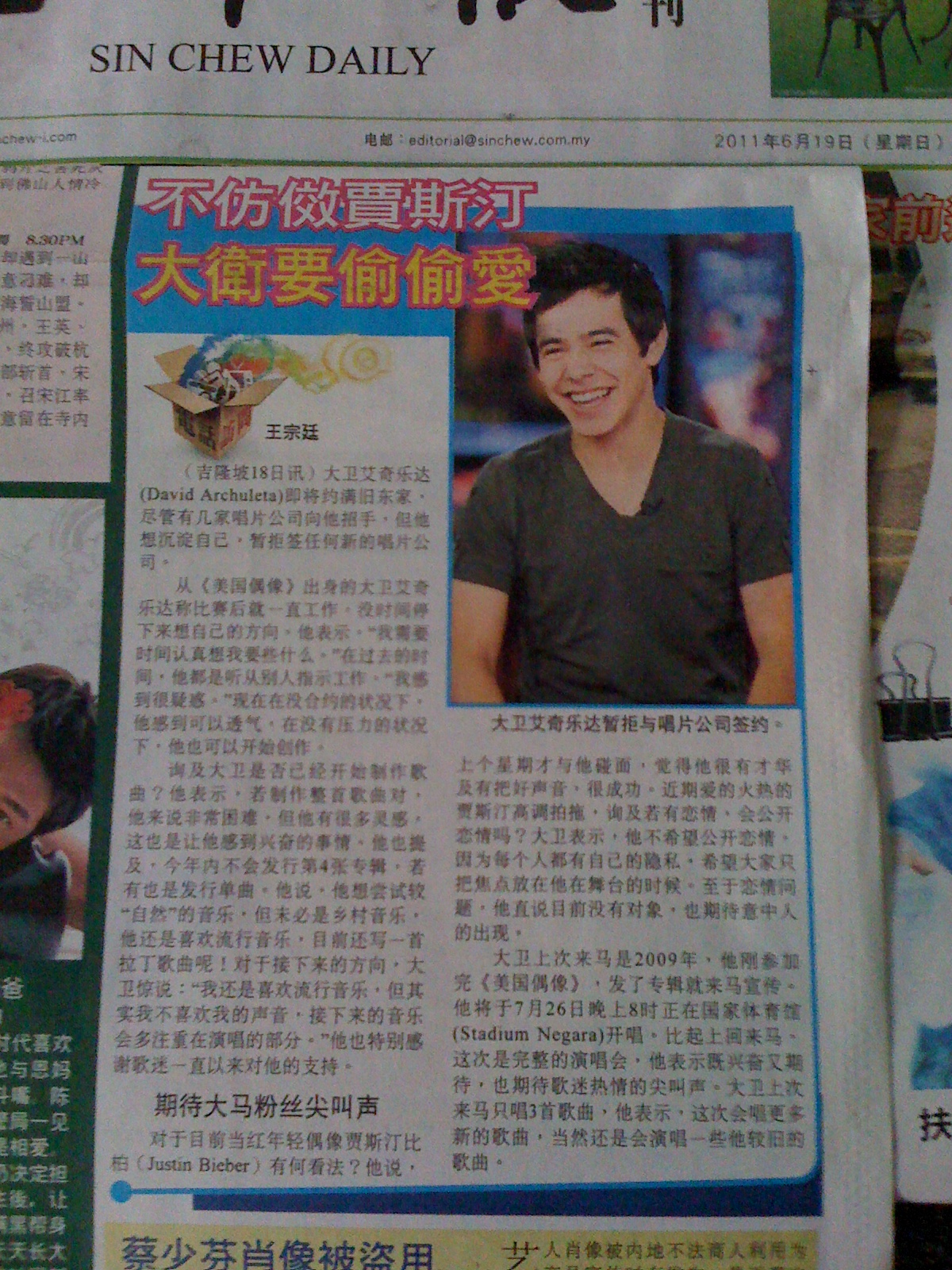 Calgary's lovely Gengen translates this interview with David Archuleta in "Sin Chew Daily," a Chinese-language newspaper in Malaysia