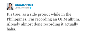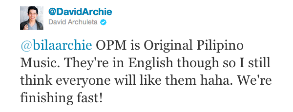 So you’ve never heard of OPM and you live in … Guelph, Ontario. 🙂 That doesn’t mean a little Original Pilipino Music as sung by the one, the only, Mr. David Archuleta won’t pretty much complete your life.