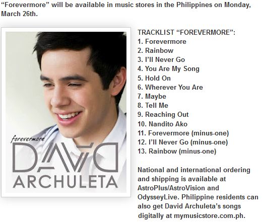 I got my FOREVERMORE album today.. My hubby gave it to me as a gift for our 15th Anniversary. He’s soooo sweet! He knew how much I love David’s music (as he does), so he went out and bought me one (we’re from Cebu, Philippines, so Astrovision is just a jeepney away). My hubby and I know all the OPM songs by memory and heart (so we didn’t really need the songbook much but the pictures, OMG!) All I can say is David’s versions of the songs are simply breathtaking!