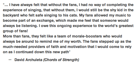 For some reason, felt like revisiting David Archuleta’s Chords of Strength today. Not the whole thing quite yet, but snippets here and there that wonderful tumblr peeps kindly posted. I find it interesting which passages struck home with different people. These are the ones that also jumped out at me … even without an audiobook, I can hear his voice say the words. 🙂