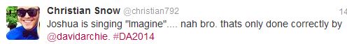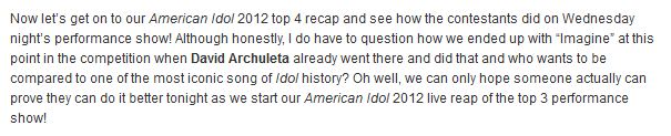 Oh thanks for all the goodies posted here. After David’s epic, history changing performance of Imagine, just can’t “Imagine” any other contestant taking on that song. Takes courage I might add and I did see Joshua’s performance and have to say he did a nice job but…..well folks, there is just no comparison. A talented guy but should have chosen another song, for his own sake, lol.