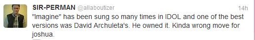I think there are songs on AI that contestants have to approach as make it or fail. David’s “Imagine” is such. And I can just hear David praising Joshua’s effort….sigh…I miss that humble, joy-inspiring 5 foot and not much more soulful & artistic spirit……guess it keeps me wanting more, eh?