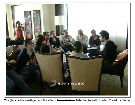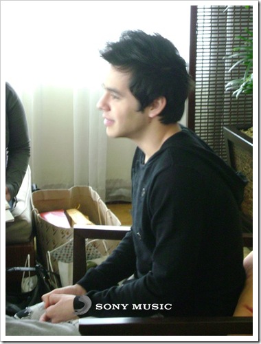 The press con was held by batches. Naree and Ditas, of Archuleta Philippines, got slots for the interview as well so I chose to join their batch instead of joining the “real writers” batches. We were the last group along with a few members of the press. There were 4 batches, I think, and as soon as the third one’s done, my knees started shaking. OMG OMG, I’m going to meet David Archuleta and I don’t have a freaking question/s to ask him yet!! But my worries went away when I saw him about 5 feet away from me. Standing. Wearing black top and tattered jeans.