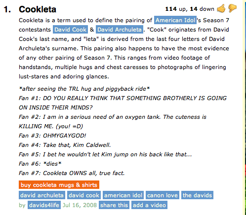 “a random riddle wrapped in musical mystery inside a salsa-dancing enigma??” Haha, one of my faves TOfan. He is definitely a musical mystery, salsa-dancing enigma! This is quite funny, the Urban Dictionary….love too how they include “Gosh” and “Hunkerdown”. The “Cookleta” pic is one of my old faves, a musical comedy team!