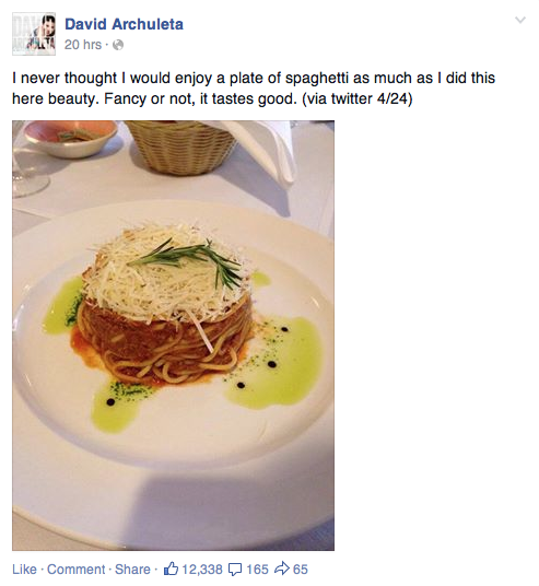 Screen shot 2014-04-28 at 9.11.32 PMCame across this really interesting article about how artists can make a decent living if they have at least 1,000 true fans. Considering Mr. David Archuleta got over 12,000 “likes” for a picture of spaghetti, methinks he’ll be okay. (Does anything in the second paragraph sound familiar? 🙂 )