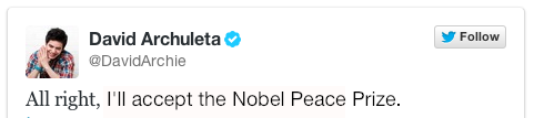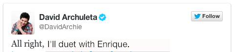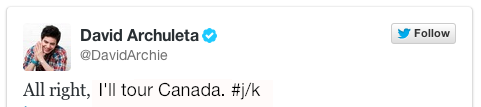 All right, I’m going to be singing on TV. Oh…so many to add to the list, haha. This is very funny, do love David’s tweets and these hopeful tweets. Love the “I’ll tour Canada” one, oh yes. Love the suggestions in comments too!