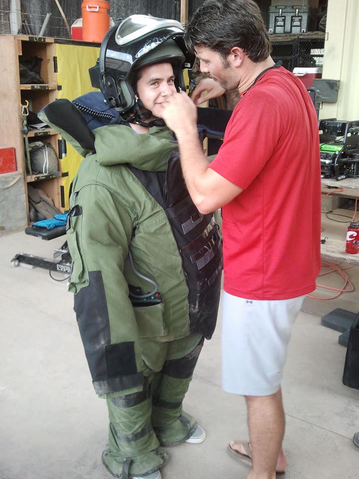 Thinking, when did our dear, sweet, shy Idol David, turn into Rambo?! Or is it GI Joe?.. or whatever…you get the point! …although….I still see those dimples through the face shield…and…he really does kinda still look like Josh Bradley in the bunny suit. šŸ™‚