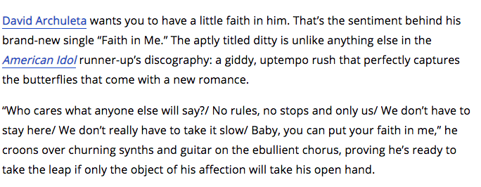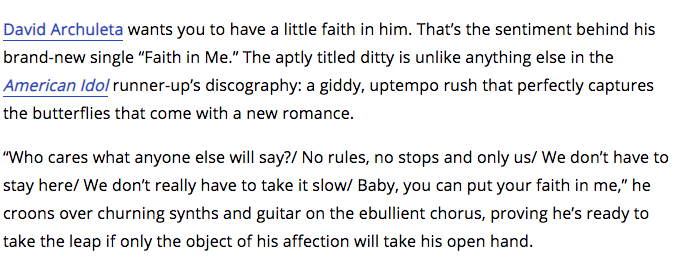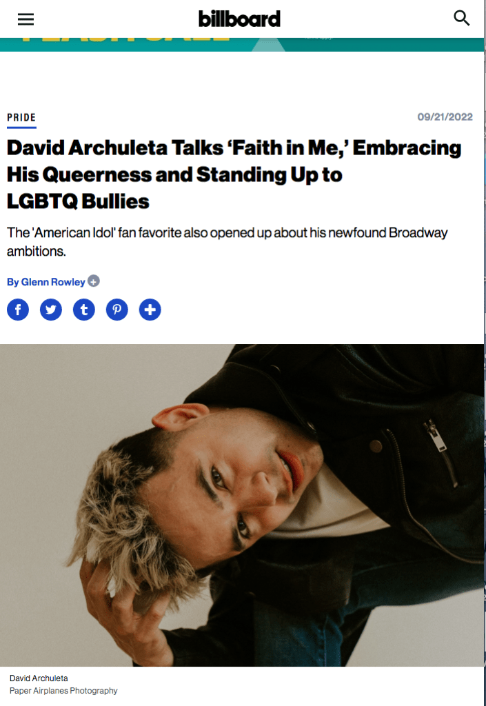 “I had a tremendous chat with David Archuleta about his coming out journey, experience on American Idol, becoming friends with Jennette McCurdy, and his new single, ‘Faith in Me’.” — Austin Ashburn, Pop Crave
